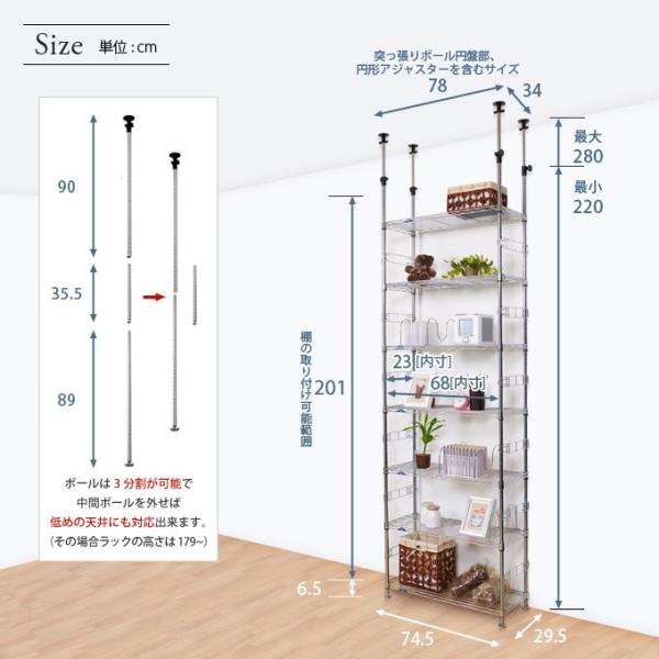 ■つっぱりポールが床から天井まで突っ張る幅76 奥行30 7段 ポール径19mm