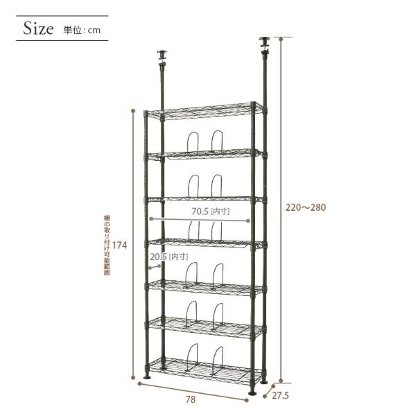 ■つっぱりポールが床から天井まで突っ張る[幅78 奥行27.5 高さ220〜280cm 7段]スチールラックです。