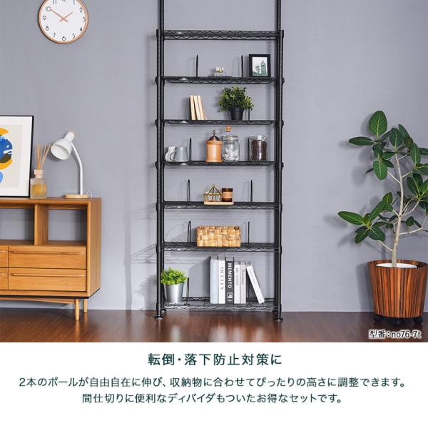 ルミナスノワール スチールラック 黒 突っ張りラック 転倒防止 壁面収納 リビング おしゃれ ブラック 幅78 奥行27.5 高さ220〜280cm 7段 NO76-7T