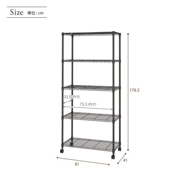 スチールラック 黒 おしゃれ 幅80 奥行40 5段 ルミナスノワール キャスター 収納 本棚 壁面収納 シェルフ キッチン レンジ 省スペース ブラック NO8018-5