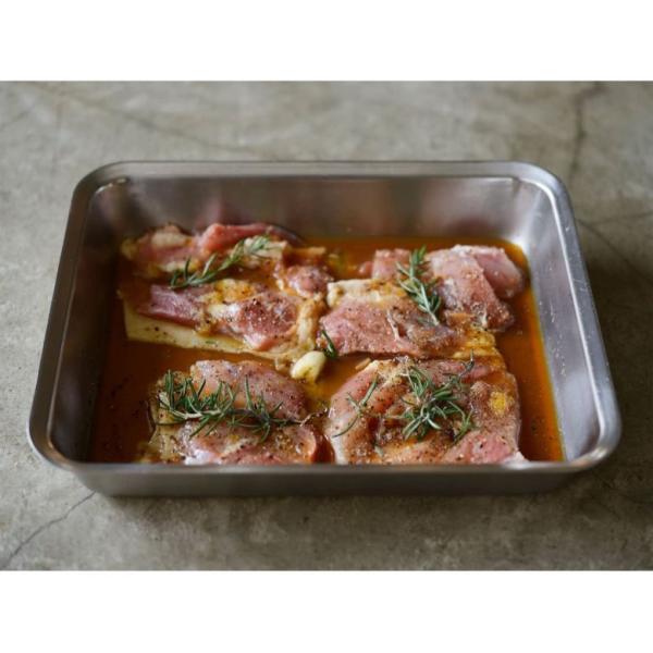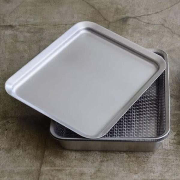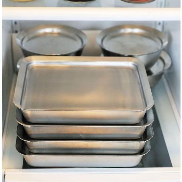 ステンレス板を立体四角形に伸ばす高度な技術で作ったのでつなぎ目がありません。縁の折り返しがないので、汚れがたまりにくく、手入れがしやすいです。お菓子やパン作りに、オーブン使用で大活躍します。(その際焼き色がつくことがあります)