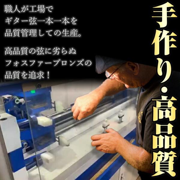 職人が工場でギター弦一本一本を品質管理して生産。高品質のフォスファーブロンズ弦に劣らぬ、柔らかく、錆びにくく、張り立てが持続し、チューニングが安定するよう品質を追求しました。ポールエンドの色分けがあり、弦交換時に混乱することなく、視覚的に区別できるよう工夫されていますので、初心者の方にはうれしい弦です。