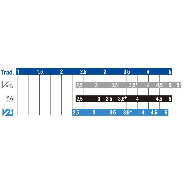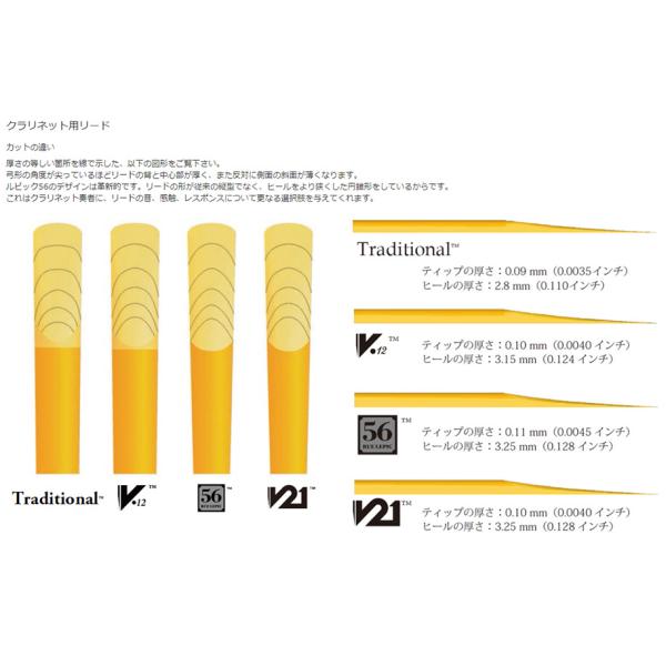 V.12リードは、ヒールが厚く、トラディショナルより若干ティップが厚く、パレットが長くカットされています。パレットが長いということは、振動しやすく深く豊かな音になります。ティップが厚いことは、最適なアタックが得られ、その上耐久性が増します。硬さを比較すると、V.12の4のリードは、トラディショナルの 3-1/2のリードとほとんど同じです。