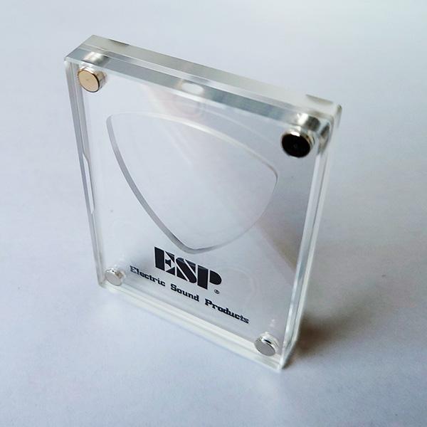 本体は3層構造で、表と裏には耐久性のある透明度の高いアクリルを使用し、ピックを嵌める中央層には曲げ強度の高いポリカーボネートを使用しています。トータルでの厚さが9.5mmあり自立できますので、机の上や飾り棚など好きなところにお気に入りピックを飾ることが出来ます。