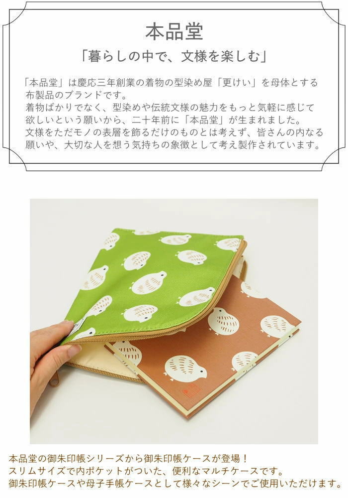 ●布製品のブランド「本品堂」で人気の御朱印帳とお揃いの御朱印帳ケースが登場しました!スリムサイズで内ポケットが付いた、便利なマルチケースです。御朱印帳ケースや母子手帳ケースとして様々なシーンでお使いいただけます。
