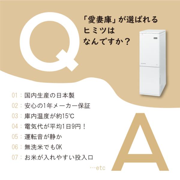 静岡製機の保冷米びつ「愛妻庫」(あいさいこ)は、高性能・高品質の日本製(国産)で、長く安心して使用できる保冷米びつとしてとても人気があり多くのお客様にご使用いただいているおすすめの米びつです。