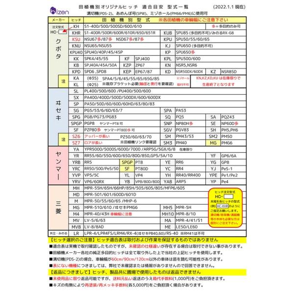 田植機用ヒッチ HC-xx 田植機用 取付 専用 ヒッチ 適合表 確認 美善 bizen 個人宅配送不可 代引不可