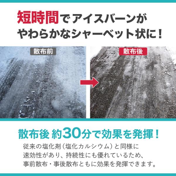 ・塩化剤と同様に速効性があり、又持続性にも優れているため事前散布・事後散布とも効果の発揮できる凍結防止剤シリーズです(散布後約30分)。