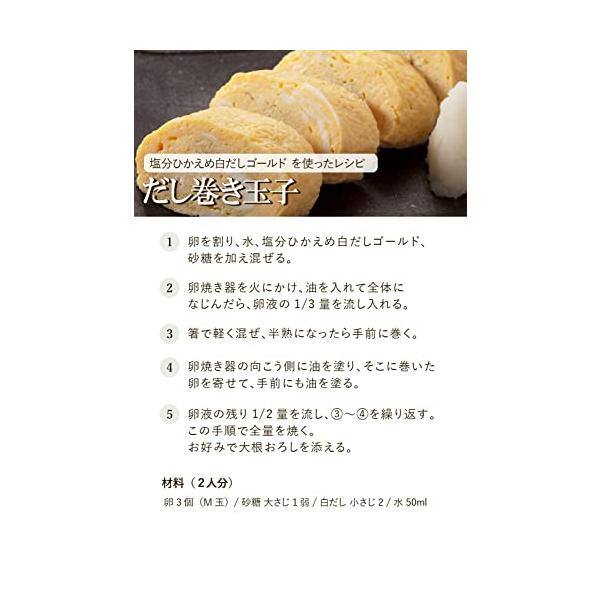 ・減塩の食卓にもワンランク上の美味しさを塩分の摂りすぎが気になる方に向けた、塩分30%カットの白だしです(当社「白だしゴールド」比)。だしの旨味で、塩分をひかえめ。 いつもの美味しさそのままに。初めての方もトライアルしやすい小容量の300mlペットボトルタイプです。素材の色を活かした料理が簡単にできます。