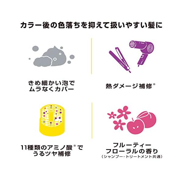 ・時短でキープ&高発色チャージフルーティフローラルの香り。1回3分の使用でしっかり染まる(長時間置けばより効果大)。たんぱく質のケラチン(毛髪補修成分)や退色を予防するヘマチン(毛髪補修成分)を配合。11種類のアミノ酸配合でキシまずなめらかな指通りへ。ブロッコリー種子油・マカデミア種子油(保湿成分)配合。