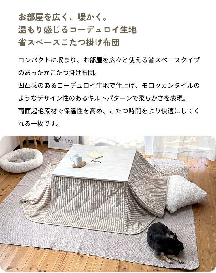 コンパクトに収まり、お部屋を広々と使える省スペースタイプのあったかこたつ掛け布団。