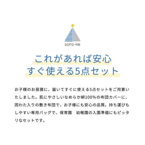 保育園や幼稚園用や、旅行などの外出時に便利な、持ち運びのできてすぐ使える、お昼寝布団の5点セットです。