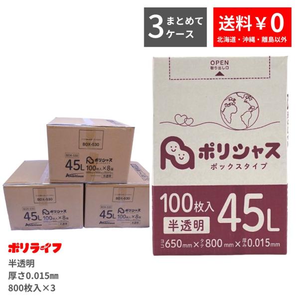 ゴミ袋 45L 半透明 100枚 箱タイプ 0.015mm厚 8小箱入×3ケース( 2400枚) 1小箱あたり641円 1枚6.41円 HDPE素材 ポリ袋 BOX-530-3 まとめて3ケース