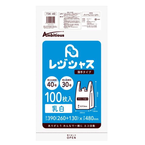 レジ袋 薄手タイプ 西日本40号/東日本30号 乳白 100枚×10冊(1000枚) 0.013mm厚 1冊あたり290円 手さげ袋 ゴミ袋 TSK-40-1kb 小箱販売