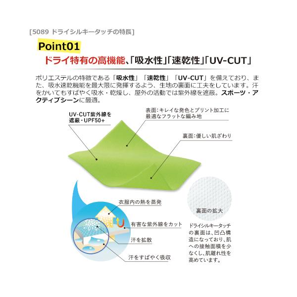 ドライシルキータッチは、汗を素早く吸収して乾かし、衣類内をドライで快適な状態に保つ素材です。