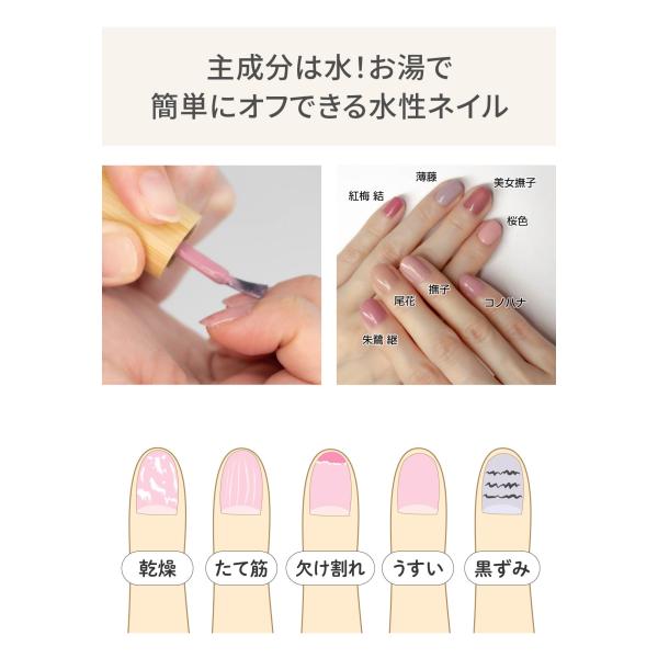 お湯で簡単にオフできる水性ネイル。気になる変色のカバーだけでなく、治療中や年齢によるお悩みの手をキレイに見えるような色を厳選