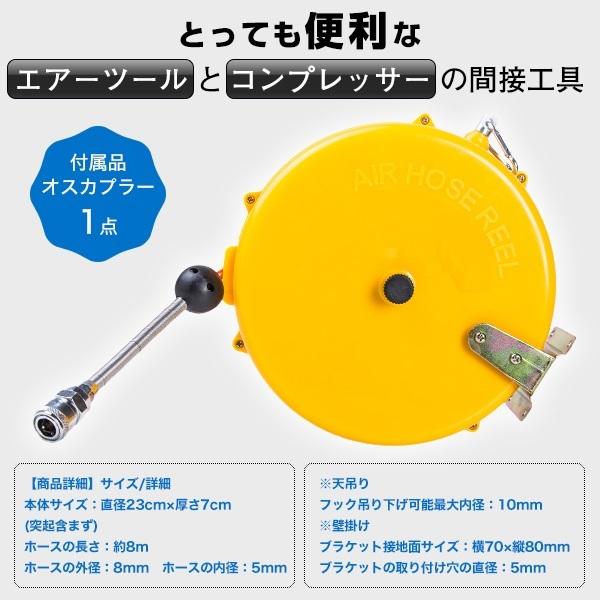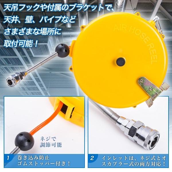 エアーホースリール 8m 自動巻き取り式 天吊り 壁掛け対応 エアーツール コンプレッサー 間接工具 自動巻上げ式 天吊フック ブラケット 天井 壁 パイプ