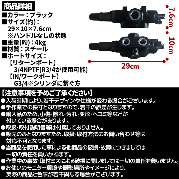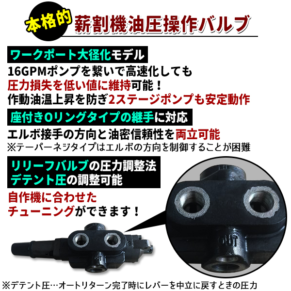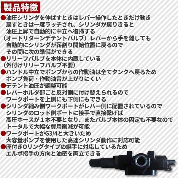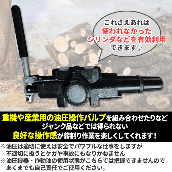 薪割り機用に作られていますので以下の特徴があり、重機や産業用の油圧操作バルブを組み合わせたり、ジャンク品などでは得られない良好な操作感が薪割り作業を楽しくしてくれます。
