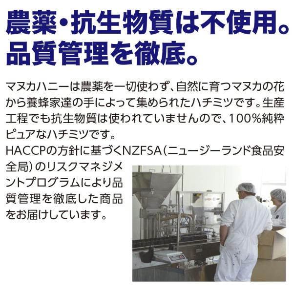 また、マヌカヘルス社の養蜂地は人里離れていますが、確認のため残留農薬(グリホサートなど)に関する定期検査も実施しております。グリホサートなど化学物質を含まない、確かな品質と安全性を追求していますので、安心してお召し上がり下さい。
