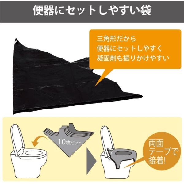 ●便器にセットしやすい三角形の袋を採用。汚物が中心に集まるため、付属の凝固剤を降り掛けやすくなっています。
