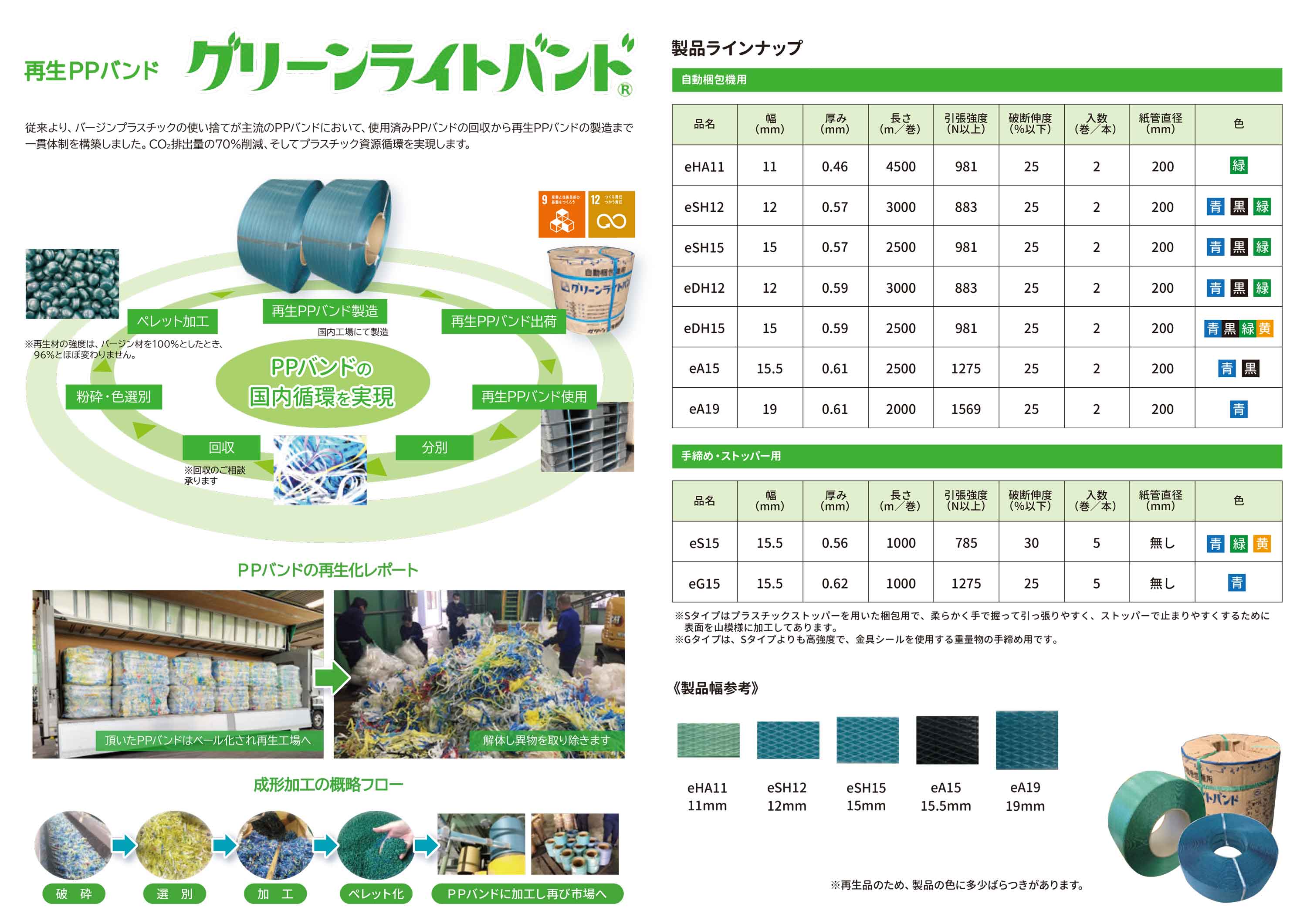 従来より、バージンプラスチックの使い捨てが主流のPPバンドにおいて、使用済みPPバンドの回収から再生PPバンドの製造まで一貫体制を構築しました。CO2排出量の70%削減、そしてプラスチック資源循環を実現します。