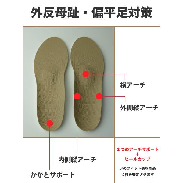 横アーチ、内側縦アーチ、外側縦アーチをサポートすることにより外反母趾や偏平足の共通問題である開張足(アーチの崩れた状態)を防ぎ、足の指にチカラが入りやすくなるよう設計されています。