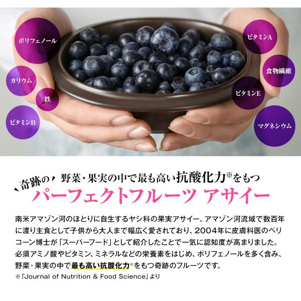 抗酸化力が高いアサイー100%。フリーズドライパウダーをそのままカプセルに入れただけのフルーツサプリです。リピート率No.1!