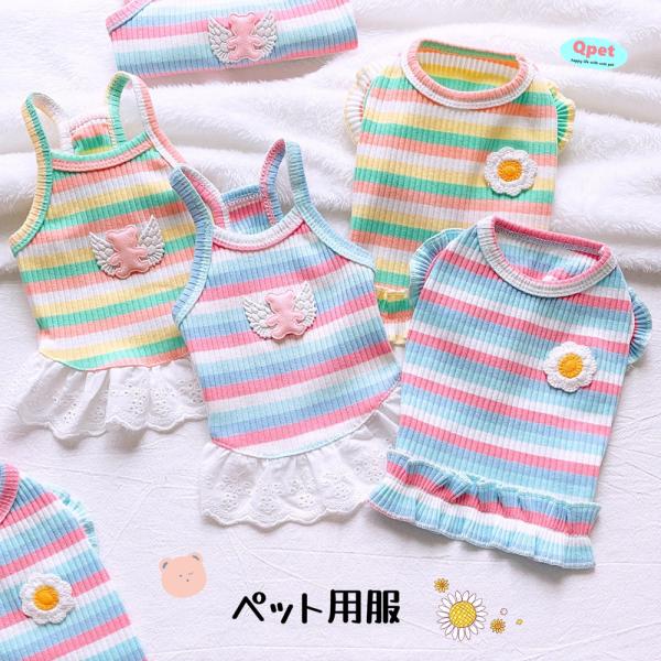 【SALEお買い得】犬服 猫服 タンクトップ キャミソール 春夏秋 フリル袖 ボーダー柄 カラフル虹 ワンピース 可愛い 天使熊 小白菊 チワワ トイプードル FS18