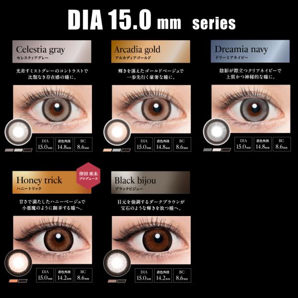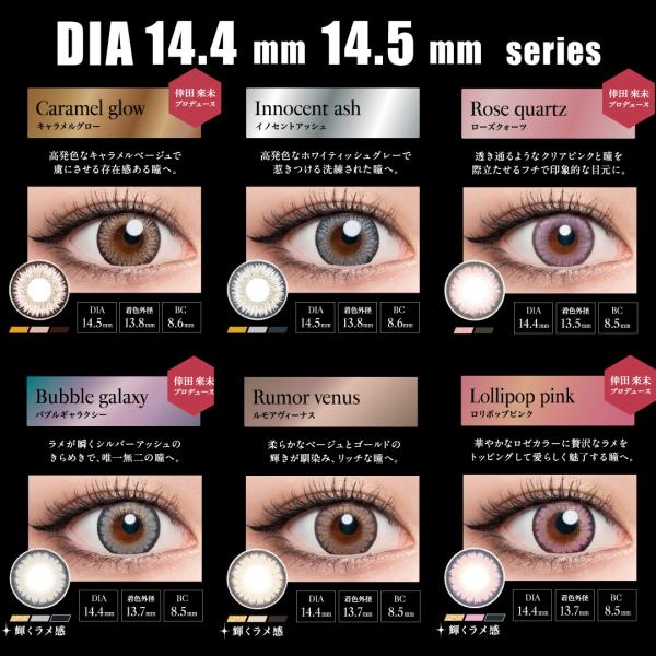 ●DIA:[14.2mm]センシュアルブラウン、ムーンリットベージュ、ラスターグレー、ミッドナイトアンバー、シルキーベージュ、シアーヘーゼル、ブラウンミラージュ、アッシュグレージュ / [14.4mm]マーメイドアクア、アディクトブロンド、ロリポップピンク、バブルギャラクシー、ルモアヴィーナス、ジャスミンアイビー、ローズクォーツ / [14.5mm]バイオレットグレア、キャラメルグロー、イノセントアッシュ / [15.0mm]ブラックビジュー、ハニートリック