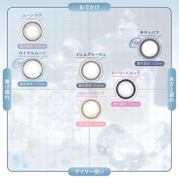 ●着色直径:13.0mm(ロイヤルムーン、ムーンラテ)/ 13.5mm(ハニーシロップ、ジェムグレージュ)/13.6mm(ドーリードロップ)/ 13.8mm(キティパフ)