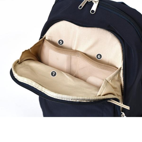 内側や外側に複数のポケットを備えており、貴重品の収納に便利な背面のセキュリティポケットも配置