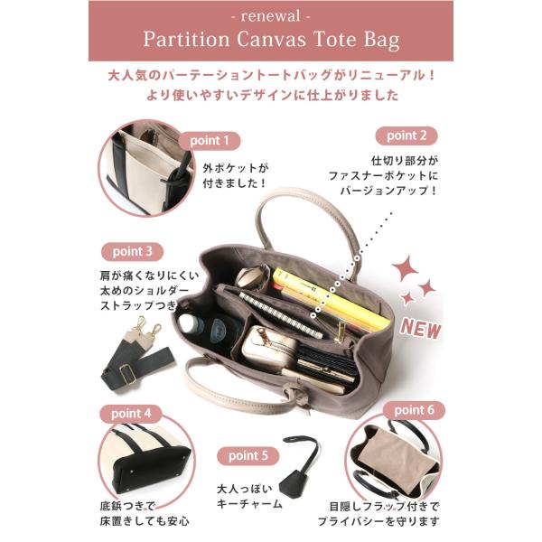 カシュカシュ cache cache ショルダー付き パーテーション キャンバス トートバッグL レディース ショルダーバッグ 斜めがけ 大きめ a4 仕切り 収納 おしゃれ かわいい 大容量 通勤 自立 軽量