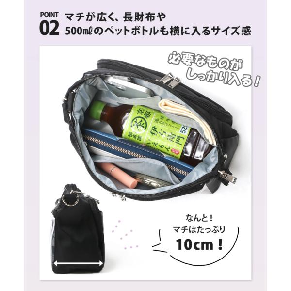 マチが広く、長財布や500mlのペットボトルも横に入るサイズ感。