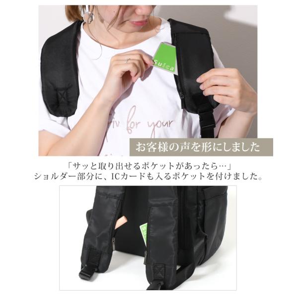 ショルダー部分にicカードや小物が入れられる、便利なファスナーポケット付き。