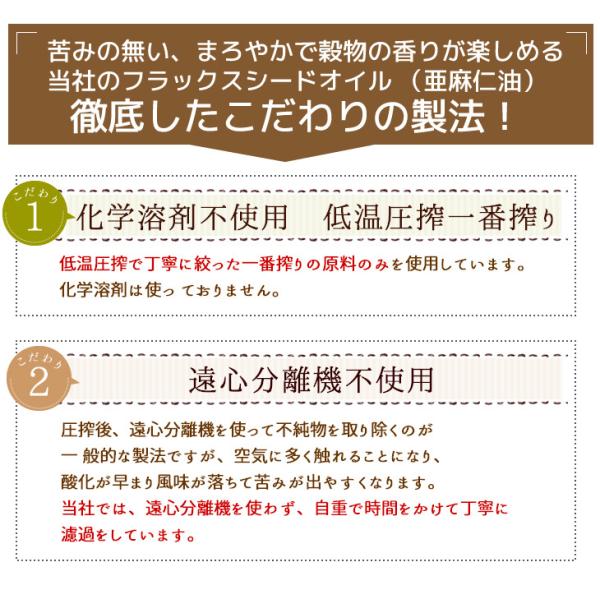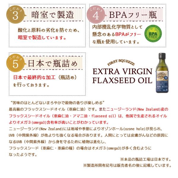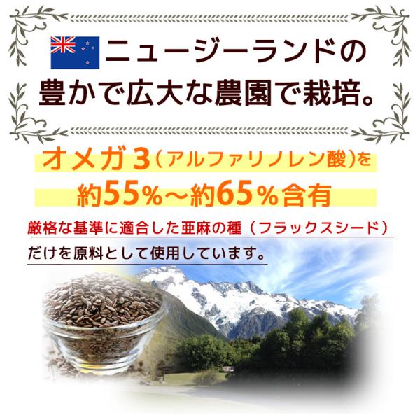 ニュージーランドの豊かで広大な農園で栽培され、厳格な基準に適合した亜麻の種(フラックスシード)だけを原料として使用。低温で圧搾機械を使用して搾っております。化学溶剤は使用しておりません。