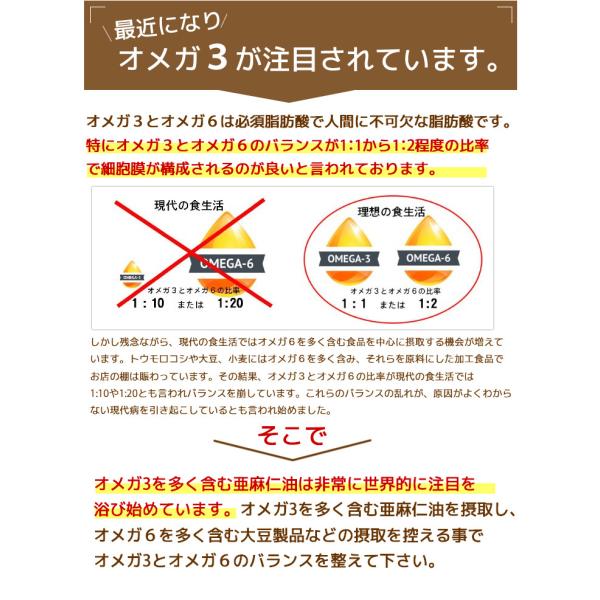 必須脂肪酸のオメガ3(アルファリノレン酸)を約55%〜約65%含んでいます。自然の成分ですので沈殿物が生じる事がありますが品質には変わりありません。無添加・無精製・無漂白・保存剤。