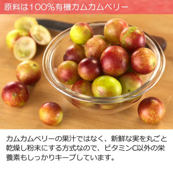 この有機カムカムベリーパウダーには約3,000mg/100gの天然のビタミンCが含まれており、その量はレモン果汁の約55倍になります。