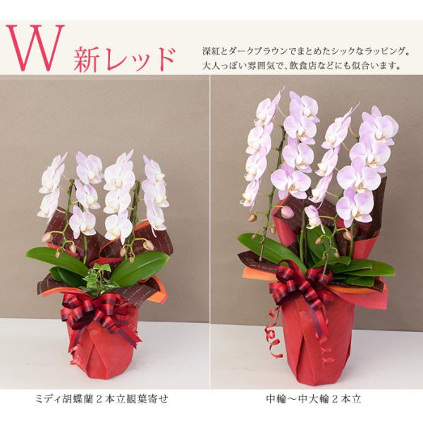 ミディ胡蝶蘭2本立ち観葉寄せ、中輪〜中大輪胡蝶蘭2本立ち に対応。