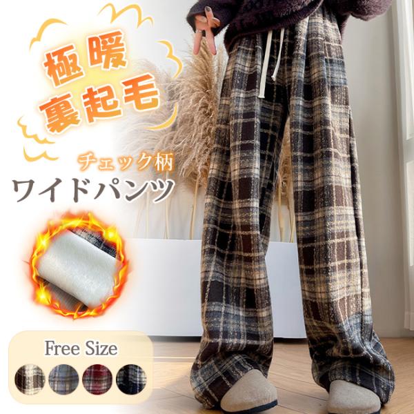 裏起毛 ワイドパンツ チェック柄パンツ レディース 秋 冬 ボトムス ロング丈 ウエストゴム 可愛い ゆったり ズボン ロングパンツ 体型カバー 防寒 爆買