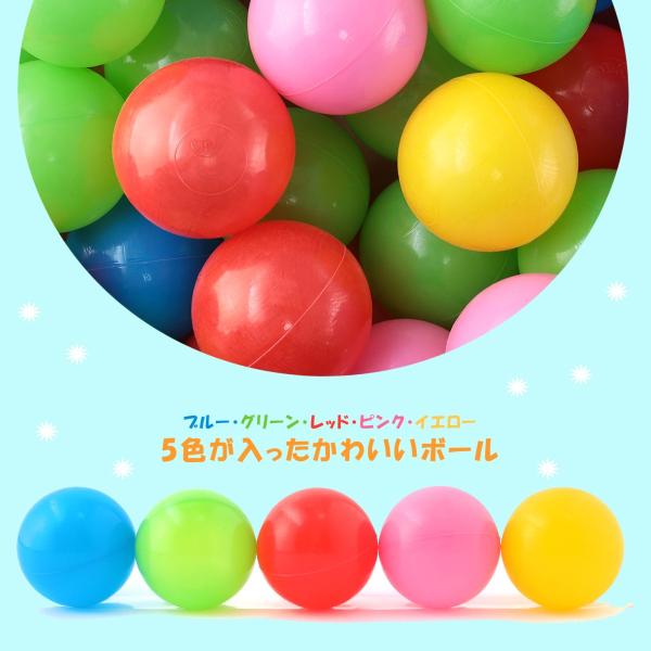 子どもが大喜ぶ!カラフルボール!ボールプールやキッズテントに入れたり、そのまま遊ぶのはもちろん、水を張った子供用プールに浮かべたり、室内用のキッズテントや子供テントやキッズサークルに入れるなど、お子さまの年齢に合わせた遊び方ができます。やわらかいポリエチレン製のボールを採用しているので、体に当たっても痛くありません。『収納に便利な特大ふくろ付き』幅80cm、高さ70cm。色々なサイズのボールもまとめて収納でき、お子さまにも楽しくお片付けに参加していただけます。『ボールの数が少ないとさびしい』とのお客様の要望にお応えして、大量のボールをまとめ買いでご提供しております。 【サイズ・重さ】7cm 約5g 【カラー】 ブルー、グリーン、レッド、ピンク、イエローの5色