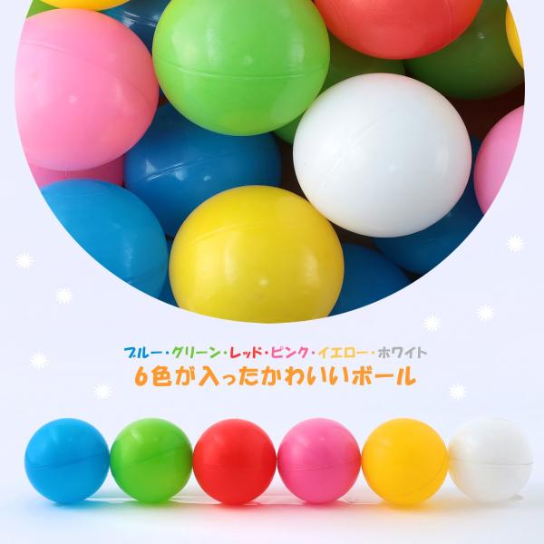 子どもが大喜ぶ!カラフルボール!ボールプールやキッズテントに入れたり、そのまま遊ぶのはもちろん、水を張った子供用プールに浮かべたり、室内用のキッズテントや子供テントやキッズサークルに入れるなど、お子さまの年齢に合わせた遊び方ができます。やわらかいポリエチレン製のボールを採用しているので、体に当たっても痛くありません。『収納に便利な特大ふくろ付き』幅80cm、高さ70cm。色々なサイズのボールもまとめて収納でき、お子さまにも楽しくお片付けに参加していただけます。『ボールの数が少ないとさびしい』とのお客様の要望にお応えして、大量のボールをまとめ買いでご提供しております。 【サイズ・重さ】8cm 約7g 【カラー】 ブルー、グリーン、レッド、ピンク、イエロー、ホワイトの6色