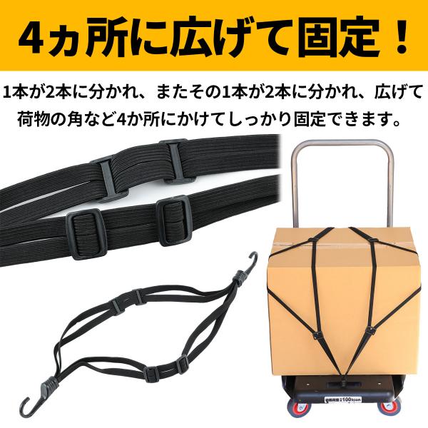 ・ゴム紐の両端には引っ掛けやすいフックが付き、鉄芯入りで強度があります。荷物を固定する時、ゴム紐部分は荷物を4つに分かれるので、安定しにくいヘルメットや鞄などを簡単に固定できます。同時に、狭い場所でも確実に掛けられて、バイク本体、自転車、カート等品物に傷を付けない。