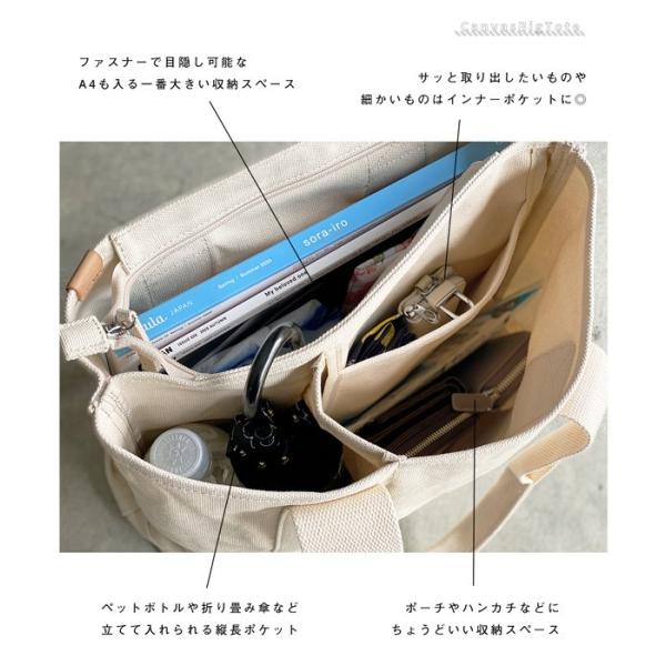3つの仕切りと2つのポケットでスッキリ収納できるトートバッグ。