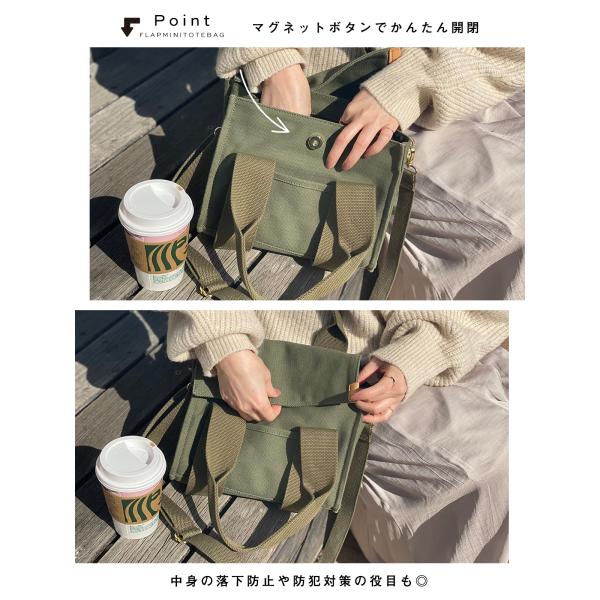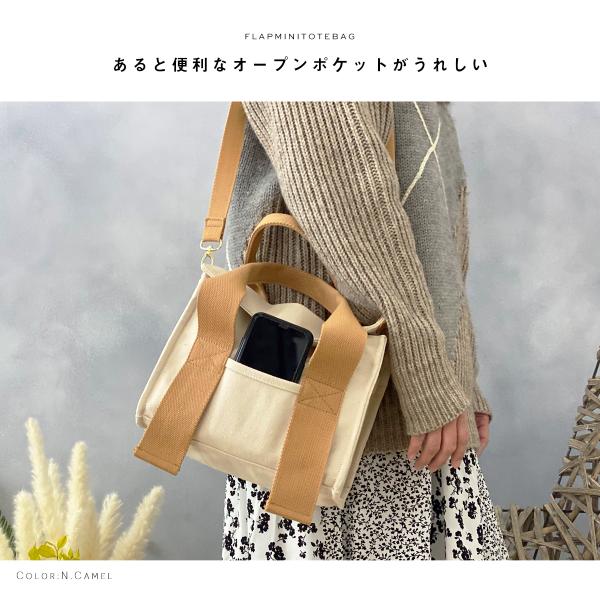 中身をカバーするフラップミニトートバッグ。