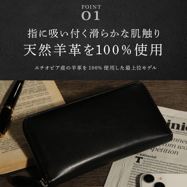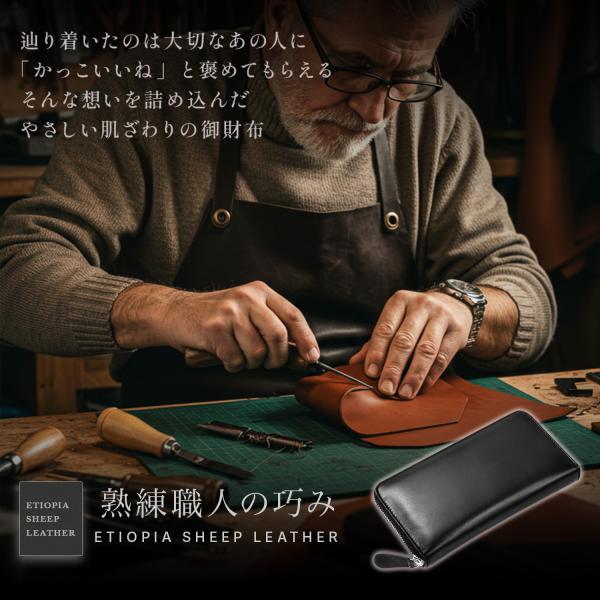 エチオピア産のシープレザー(本革)100%の長財布です。光沢が少なく、しっとりと手に吸い付くような質感です。シープレザーの特徴として、牛革に比べて軽量で柔らかく、しっとりとした肌さわりになります。高級ブティックでも最上位の位置付けで取り扱われることがあります。