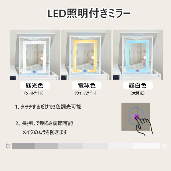 特に注目すべきは、LEDミラーに搭載された3色調光機能です。自然光、白色光、暖色光と、お好みや用途に合わせて光の色を変えることができ、メイクの精度を格段に向上させます。また、ミラー部分はクリアで広々としており、使い勝手も抜群です。