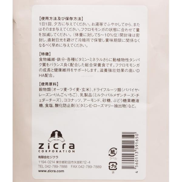 フクロモモンガのための総合栄養食。素材にこだわった安心のフード、嗜好性も抜群。ミネラル、ビタミン、鉄分などバランスよく配合。■主原料 穀物類(オーツ麦、ライ麦、玄米)、ドライフルーツ(パパイヤ、レーズン、リンゴ、イチゴ)、乳製品(ミルク、パルメザンチーズ、チェダーチーズ)、ココナッツ、アーモンド、砂糖、ブドウ糖果糖液糖、食塩、酸化防止剤(ビタミンE、ローズマリー抽出物)など