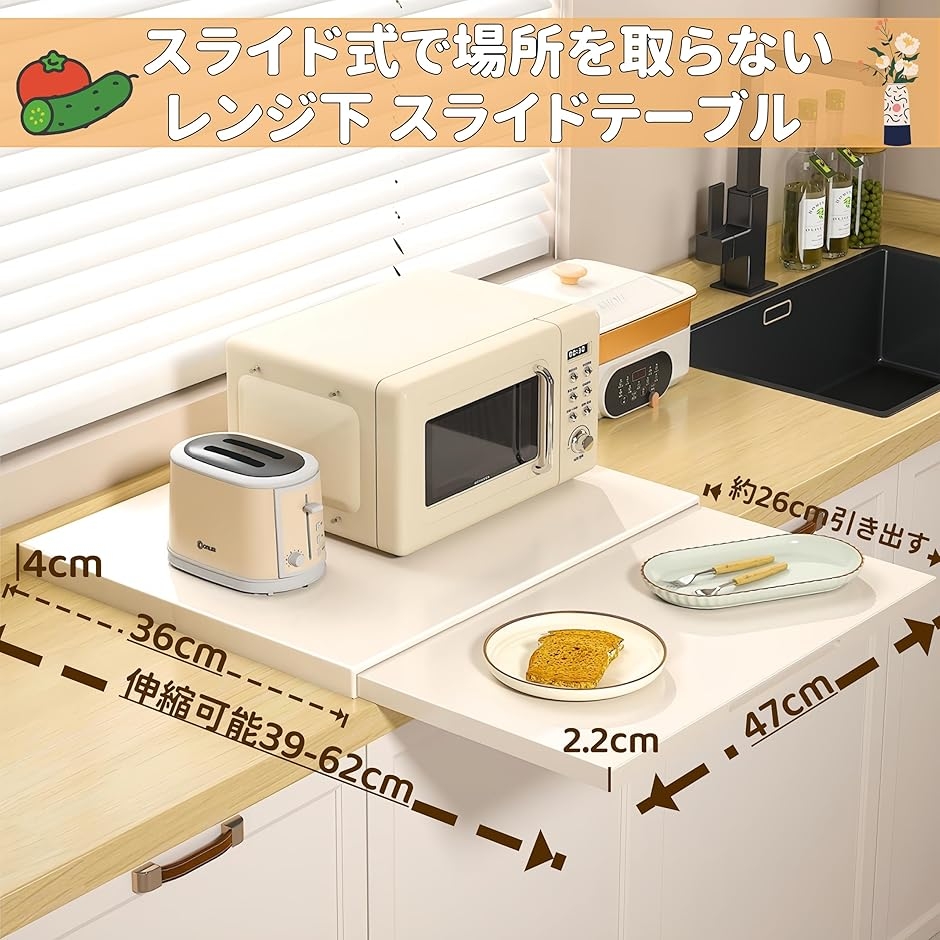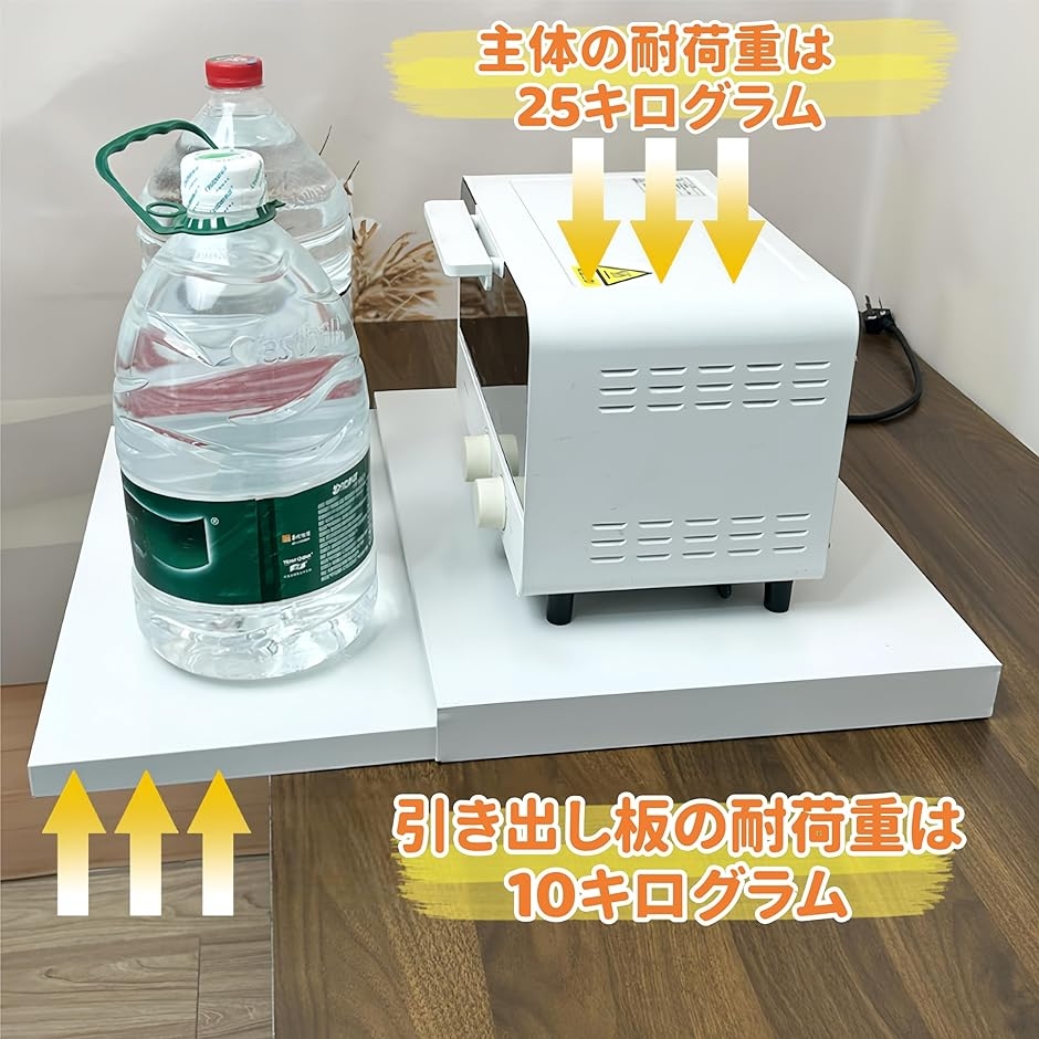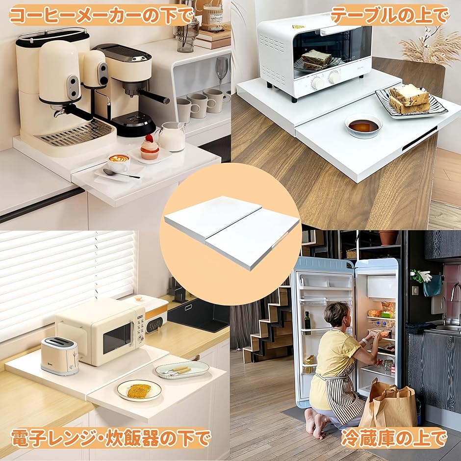 キッチン 家電下 スライドテーブル レンジ下収納 天板耐荷重25kg 多機能 引き出し作業台 (ホワイト, 47x36-62x4cm)