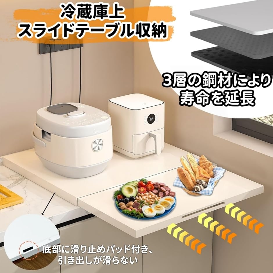スペースを最大限活用でき: スライド式テーブル付きで、食事の仮置き場や調理器具の一時置き場として使用可能。