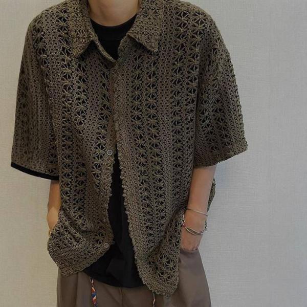 透かし編み ニット半袖シャツ メンズ サマーニット トップス 無地 薄手 デザイン 編みシャツ